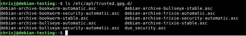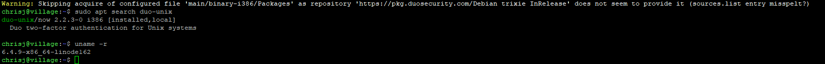 Returning to the Duo-Unix page, they do have options for installing on different distributions. The page says they tested against Trixy (Debian 13), but the commands are still for Stretch and older. They also don’t include the signing key info in the source list file.